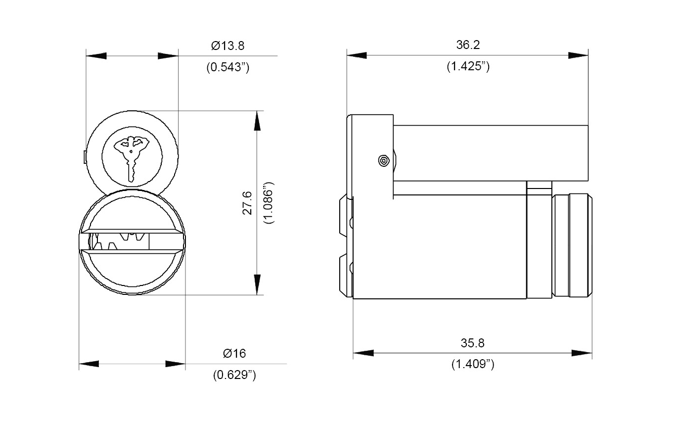 Application Compatible with "Prefer" lock cases, models 6011, 6211. Operation 360˚ rotation with operating key. Materials Body and plug: high-quality brass Pins: nickel silver and stainless steel Standard finishes Brass Cylinder mechanism Mul-T-Lock's unique, high-precision pin tumbler system. Keys Reversible nickel silver key with plastic key head and colored insert. Also available in all nickel silver. Cylinder platforms Classic; Interactive®+; MT5® Cylinder options Keyed different Keyed alike Master keyed |
