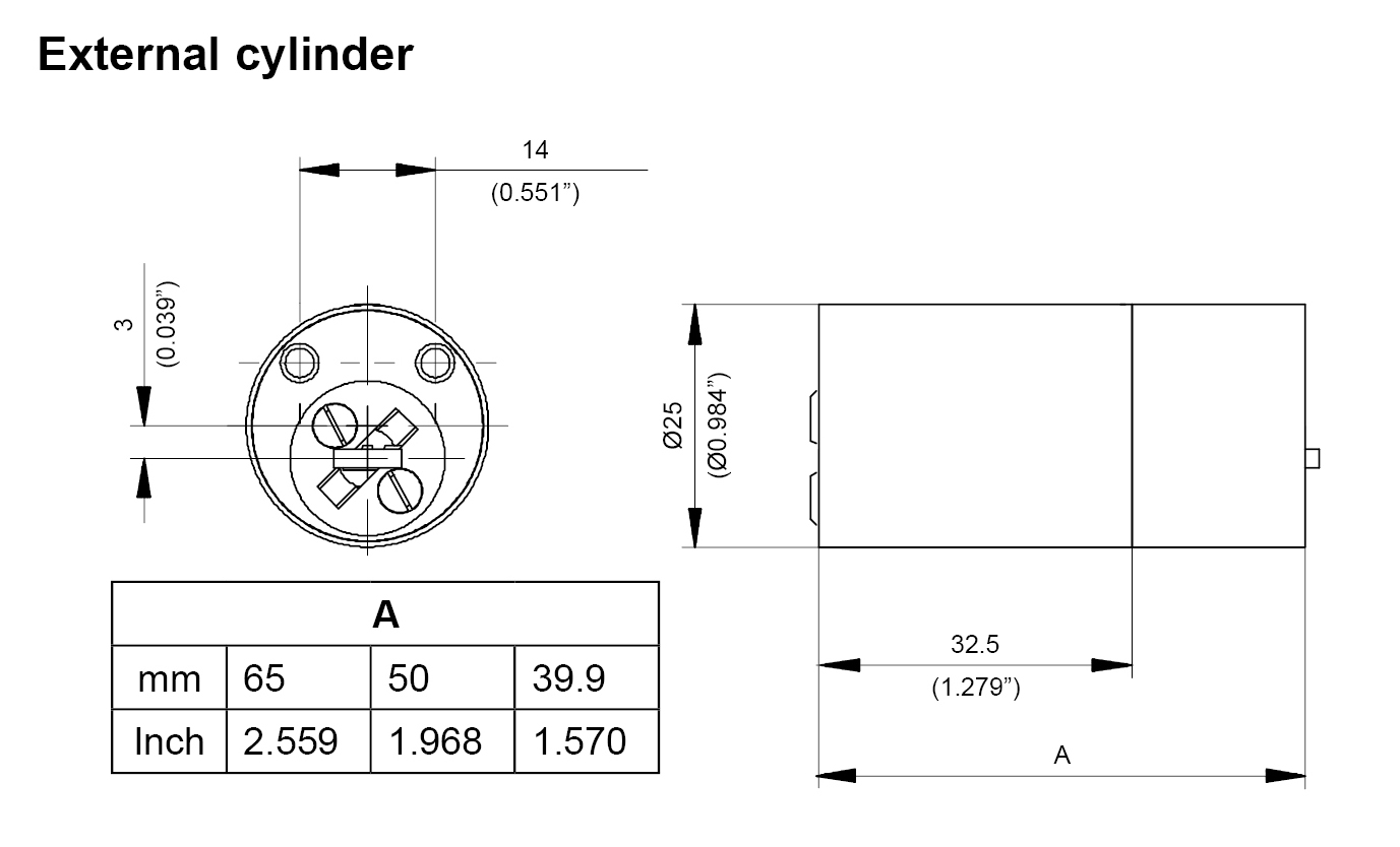 Application Compatible with "Cisa" surface-mounted lock cases. Operation 360˚ rotation with operating key. Options Pair of internal and external cylinders External cylinder only Materials Body and plug: high-quality brass Cam: steel Pins: nickel silver and stainless steel Standard finishes Nickel satin; Brass Cylinder mechanism Mul-T-Lock's unique, high-precision pin tumbler system. Internal cylinder with 2 chambers. Keys Reversible nickel silver key with plastic key head and colored insert. Also available in all nickel silver. Cylinder platforms Classic; Interactive®+; MT5® Cylinder options '3 IN 1' (changeable combination) Keyed different Keyed alike Master keyed cylinder-for-cisa-type-locks_ext_drw.jpg |